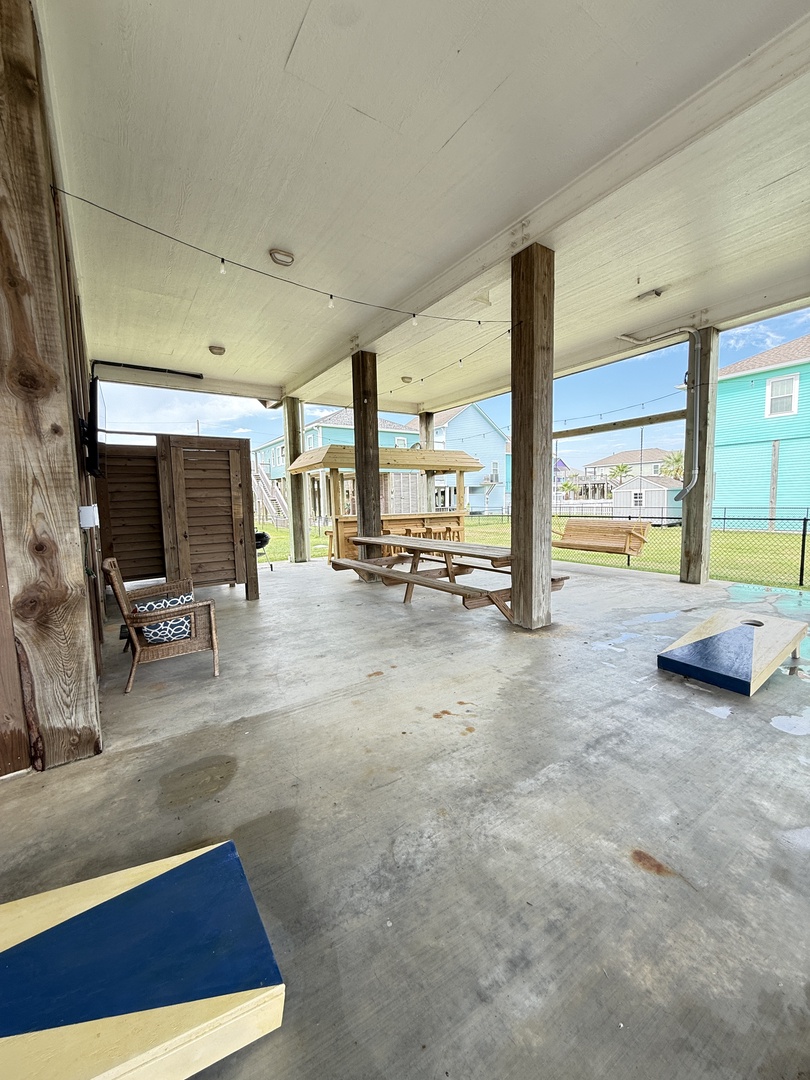 The covered area downstairs is perfect for grilling, eating at the picnic table, playing corn-hole, shooting hoops, or children running around laughing. Be sure to take a refreshing shower in the enclosed area, after a fun-filled day on the beach, which is just a short walk, golf cart, or vehicle ride away. Bedroom 1 has a queen bed and a twin/twin bed, bedroom 2 has a queen bed and a twin bed, and bedroom 3, which is the primary bedroom, has a king bed and a twin bed.