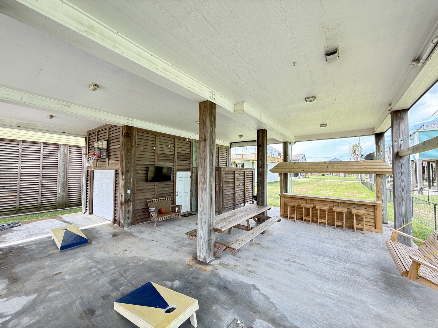 The covered area downstairs is perfect for grilling, eating at the picnic table, playing corn-hole, shooting hoops, or children running around laughing. Gather around the downstairs TV at the end of the day and enjoy a movie with the whole gang. Be sure to take a refreshing shower in the enclosed area, after a fun-filled day on the beach, which is just a short walk, golf cart, or vehicle ride away.