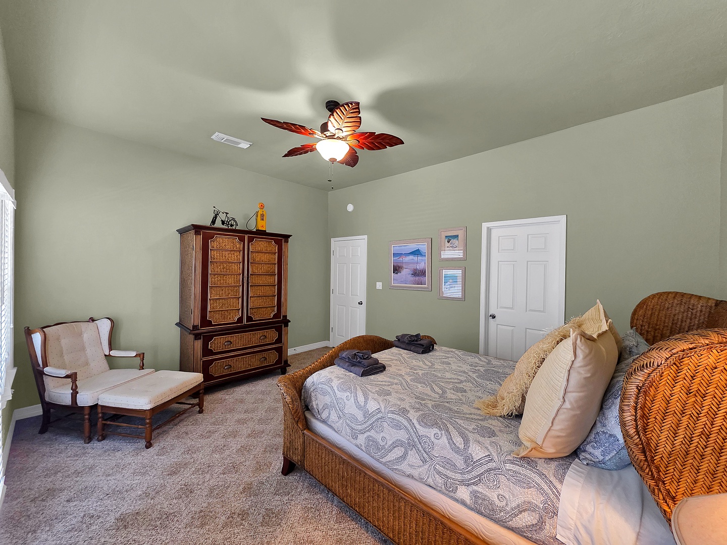 Renters Must Be 25 years of age or older to rent. Geaux-N Coastal is a fisherman's dream rental home. This well-loved home sits on the canal with direct access to the Intracoastal Waterway. It has a dock to park your boat, areas to fish off the deck, throw in a crab trap, and even a fishing station to clean your fresh catch, a covered concrete area for entertaining, including a fire-pit area. There is even an outdoor shower area. Outside, you will find a spacious deck offering covered and uncovered sitting areas. Enjoy your favorite beverages while viewing our glorious sunrises and breathtaking sunsets over the water! Inside this lovely home, you will notice a dining space/kitchen area with bar seating. Everything you need to make delicious meals can be found in this well-stocked kitchen. The cozy living room provides ample seating for you and your guests to gather or watch your favorite streaming movies or shows on the smart TV. Just enter the WIFI information posted in the house. When the evenings are chilly, the living room has a gas/wood-burning fireplace that will keep you warm and toasty. The 3 bedrooms offer comfortable bedding in a coastal theme. The primary bedroom has an attached bathroom with a walk-in shower and a vanity/make-up table. The primary bedroom and bedroom 2 both have queen beds. In bedroom 3 you will find a full bed, a twin/full bunkbed, and one single trundle bed. There is also a queen sofa bed in the living area. Once you "Geaux-Coastal," you'll be "Geaux-N Coastal" all year long!
