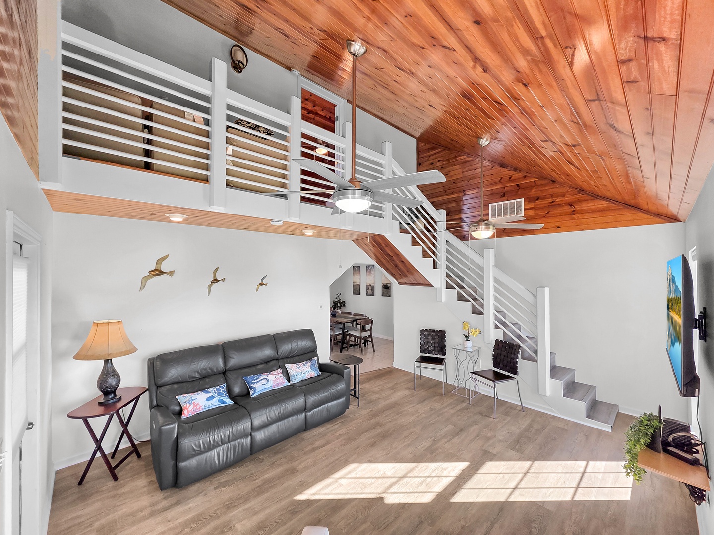 Over the Rainbow is a unique bayside cottage with 3 bedrooms and 2 and a half bathrooms. It sleeps 10 and is pet-friendly. A separate $200 pet fee is required in addition to your rental expenses. The uniqueness of this home is that it is not on piers, making it perfect for renters who don't like climbing stairs! The comfy living room has ample seating for all of your guests and a TV for streaming your favorite show or movies. You will find the login and password information for the WIFI, conveniently displayed in a frame near the TV. The kitchen has all the necessary amenities to make meal preparations quick and easy. The dining table is spacious and a great spot for gathering to play games, put together a puzzle, or have a family dinner. Off of this kitchen/dining area is a screened-in porch. This is an awesome sitting area for early morning coffee without pesky flying critters! Just off the screened porch is a laundry room and half bathroom. This home has a bedroom with a queen, and a bedroom with 2 sets of twin/full bunk beds. There is also a guest bathroom. All of these are on the ground level. Upstairs, you will find the primary suite with a king bed and an attached bathroom with a step-in shower. On this upstairs level, there is access to the large deck. You will have amazing views of sunrises and sunsets from here! You might even get glimpses of the boats out on the Intracoastal Waterway. Outside is a large, covered carport area that can be used for cookouts, family gatherings, kid's play area, or parking vehicles. Over the Rainbow- "Skies are blue and dreams really do come true!"