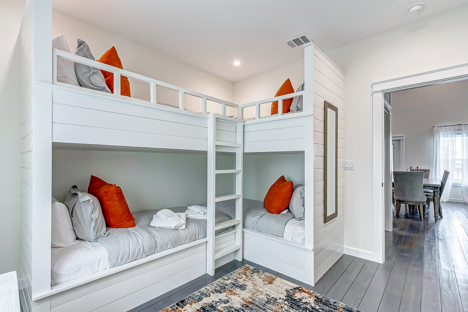 Seaside Escape is a newly built home in the Roll Over Bay Villa's located in Gilchrist. This home has three bedrooms, a loft, three full bathrooms, and comfortably sleeps 10 guests. Remember your Furry Friends, this home is pet friendly and allows up to 2 dogs under 40 pounds each. Just pay the $200 Non-Refundable pet fee. The open-concept living/kitchen area is perfect for gathering watching TV, and creating family meals together in the well stocked kitchen. Upstairs in the loft, You'll find a foosball and arcade game, sleeper sofa, and TV. Two of the guest bedrooms feature king size beds, TV's, and attached bathrooms. The youngsters will enjoy the designated "bunk" room. This home has internet to keep you connected and to stream your favorite shows and movies. Just enter the password information located near the living room TV. Enjoy the beautiful sunrises and sunsets sitting on the deck or watch for the many varieties of birds that flock to this area. Downstairs, you will find the covered area shady and just great for hanging out with family, or eating something scrumptious that was cooked on the charcoal grill. In this neighborhood, you will also have access to a children's playground and a community swimming pool as well as Community Lounge Area. When the sand and waves call out, you are a short vehicle or golf cart ride to the beach. After returning, be sure to rinse off in the downstairs shower. You will have an amazing time at this beauty with all off it's amenities. You can find your "Seaside Escape" at this home! You will find a king bed in bedroom 1 and also in bedroom 3. There are 2 twin/twin beds in bedroom 2 and a queen sofa bed in the living area.